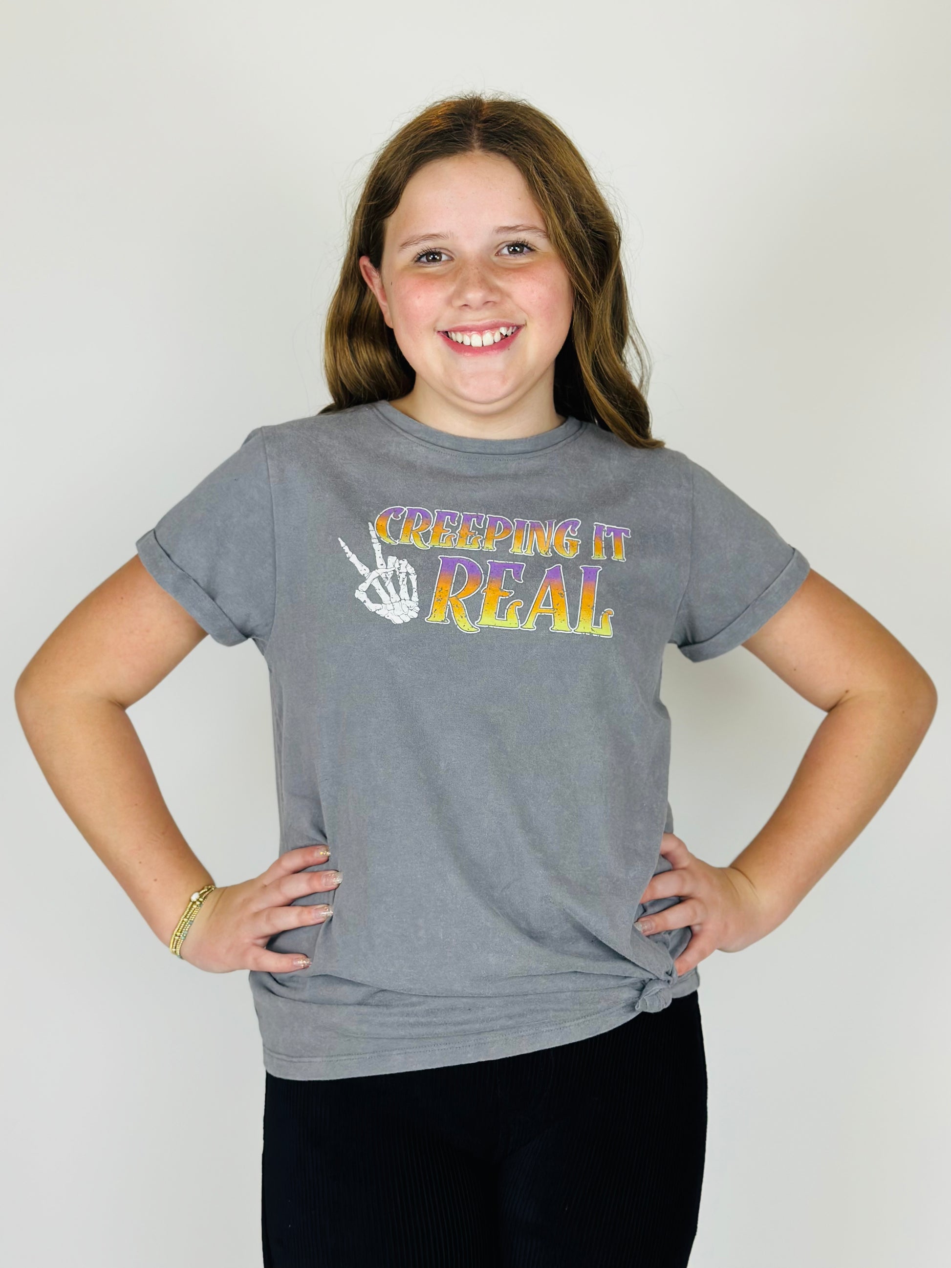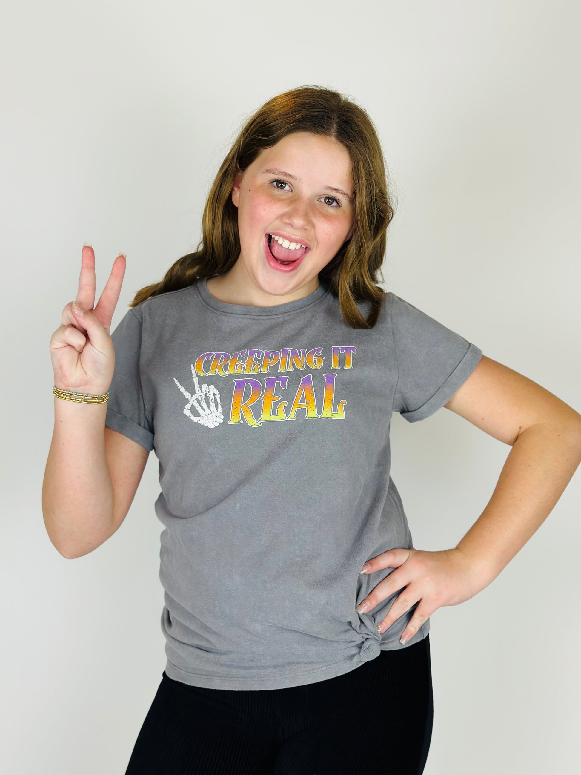 Distressed side tie roll cuff acid washed Halloween graphic tee.