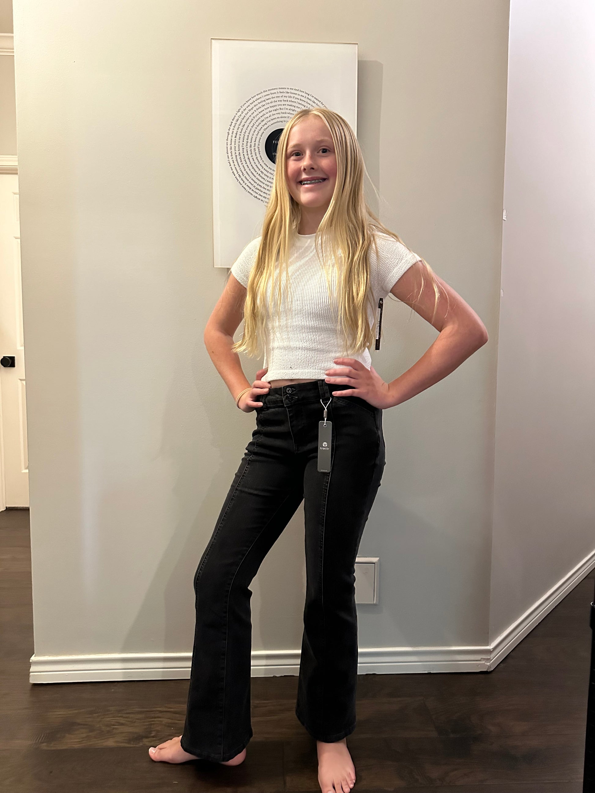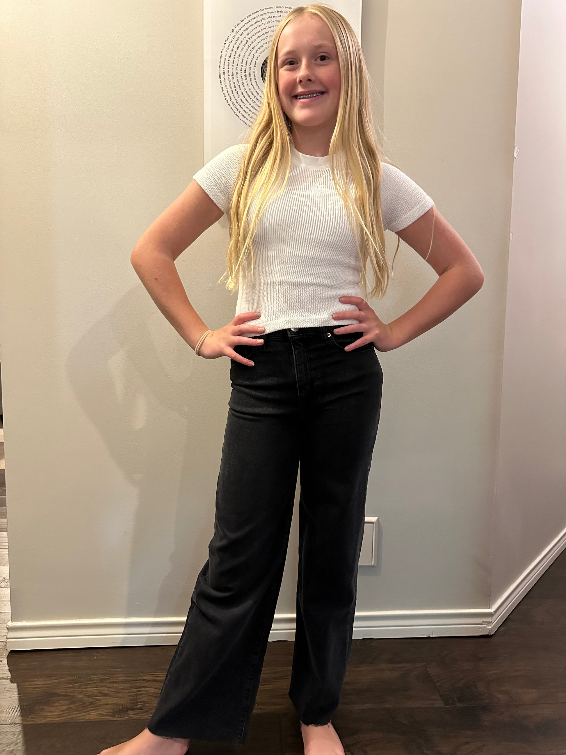 Lily is a high rise, wide leg pant that is fitted through the waist and seat. Featuring a cropped inseam, Lily is the perfect addition for your little fashionista to keep on trend.