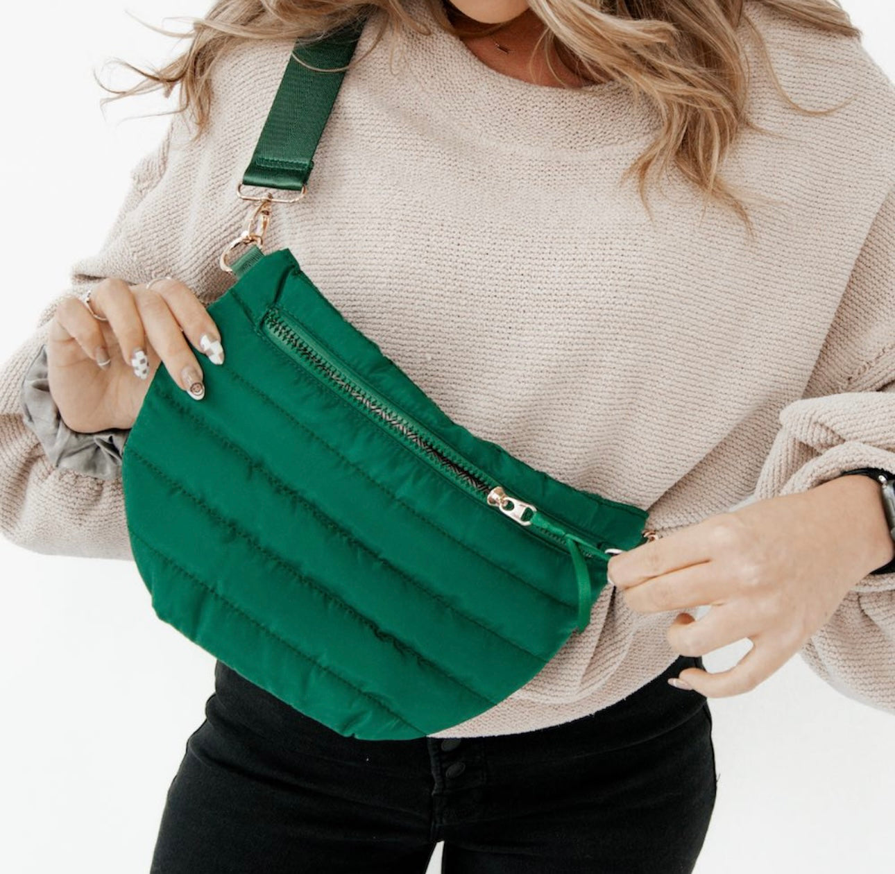 This bag is a trendy take on the updated fanny pack that can be worn in multiple ways. Wear it as a belt bag/fanny pack, crossbody, or shoulder bag. It features a fun half moon shape with a coordinating shiny canvas strap and gold hardware and a pop of color with ribbon accent. We are obsessed with this style and the front zipper for easy access!