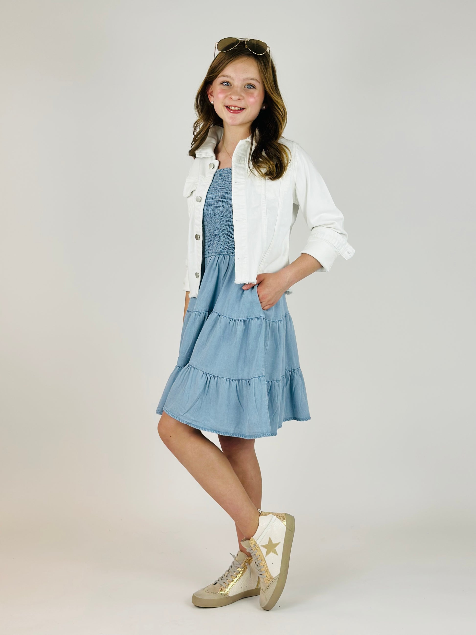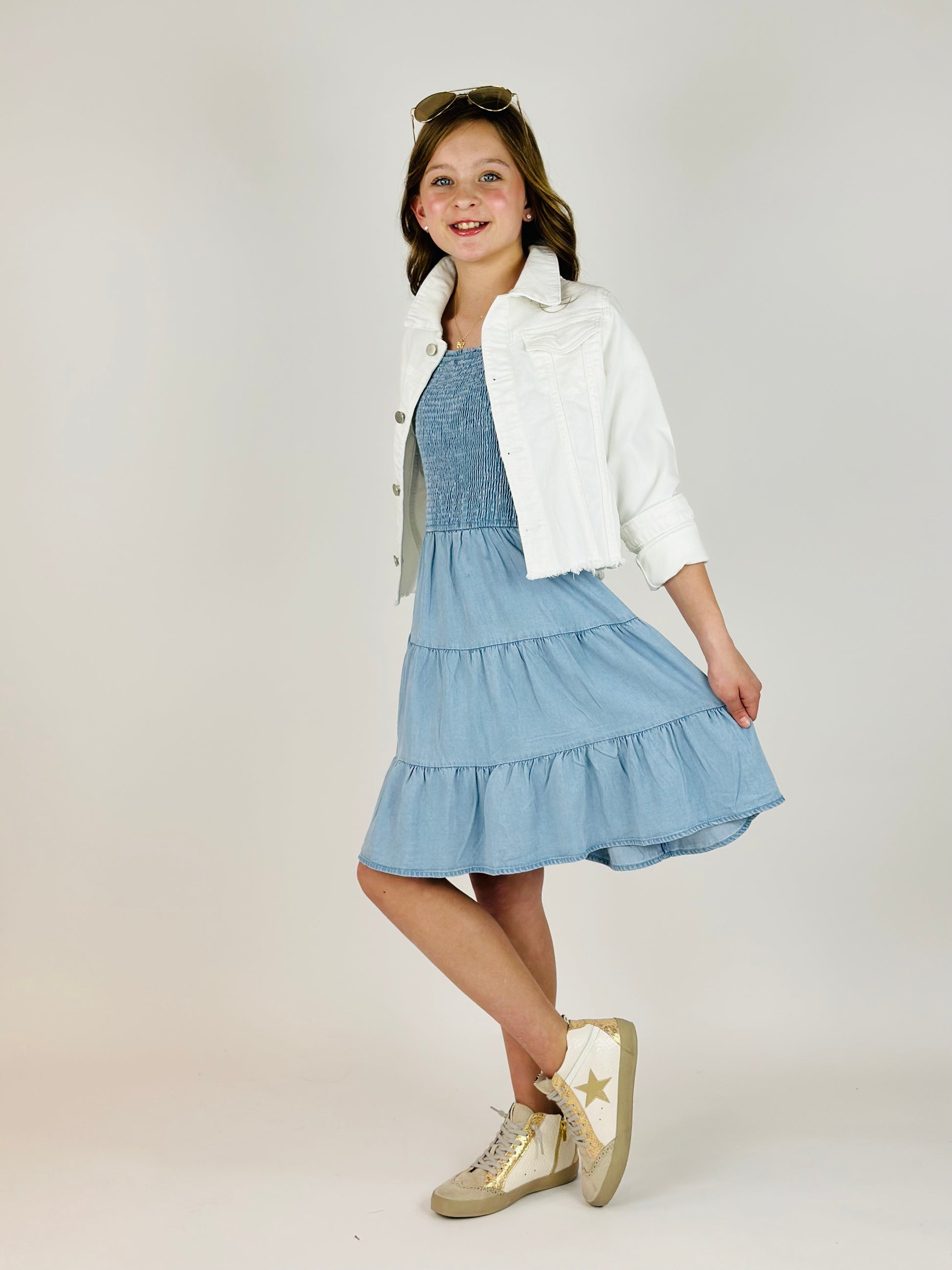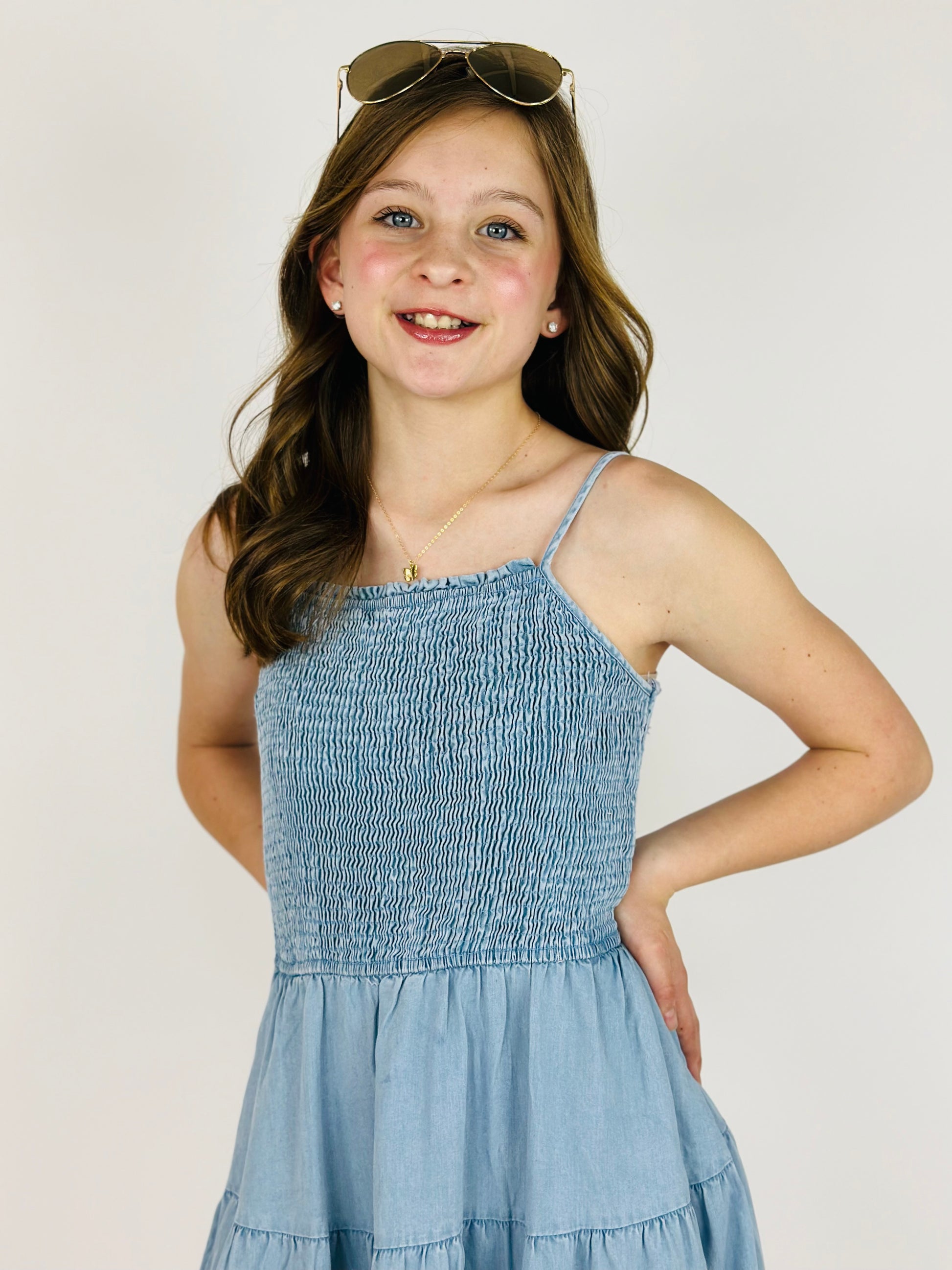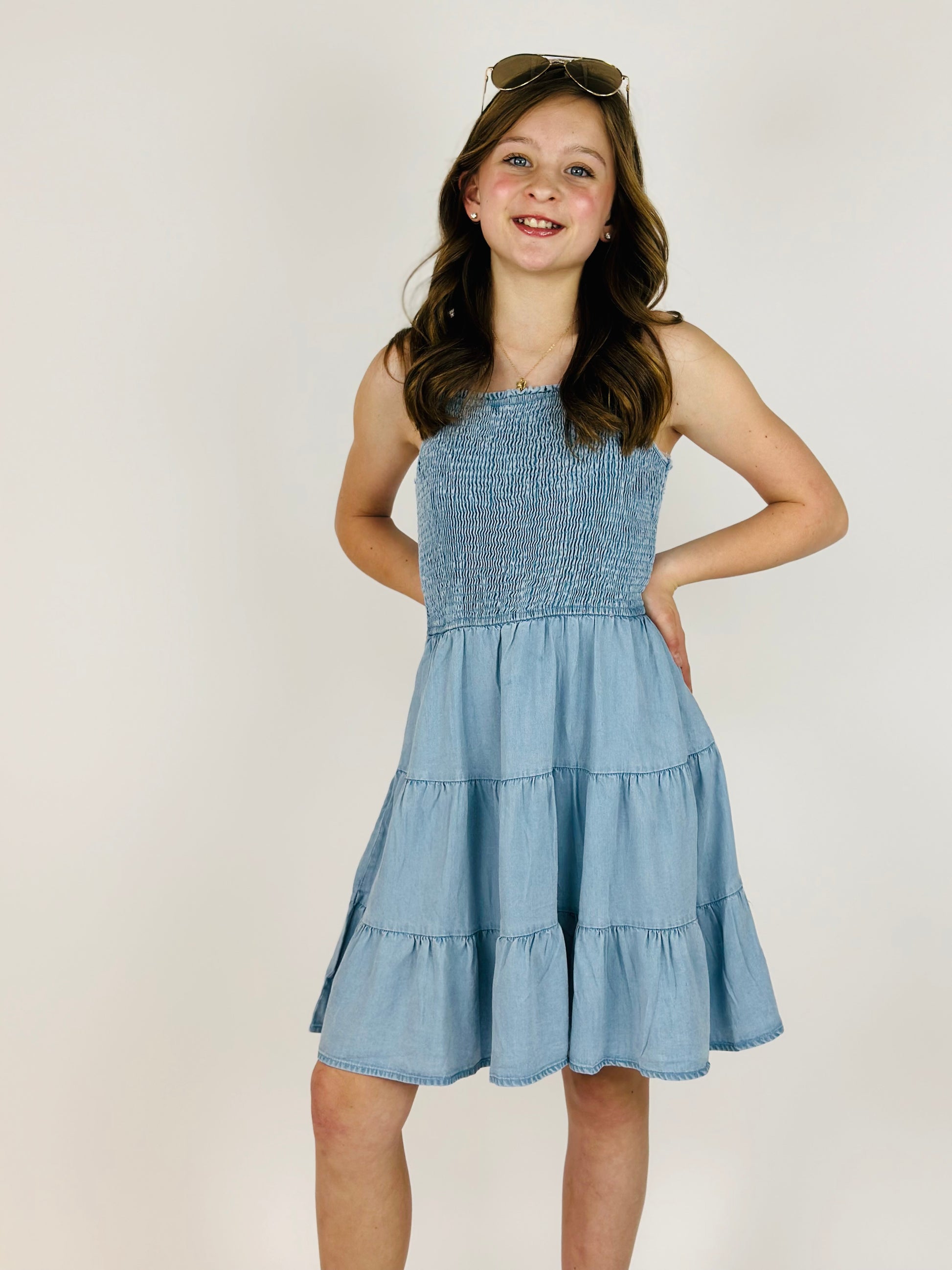 Smocked Tiered Skirt Mini Dress - Denim Tencel